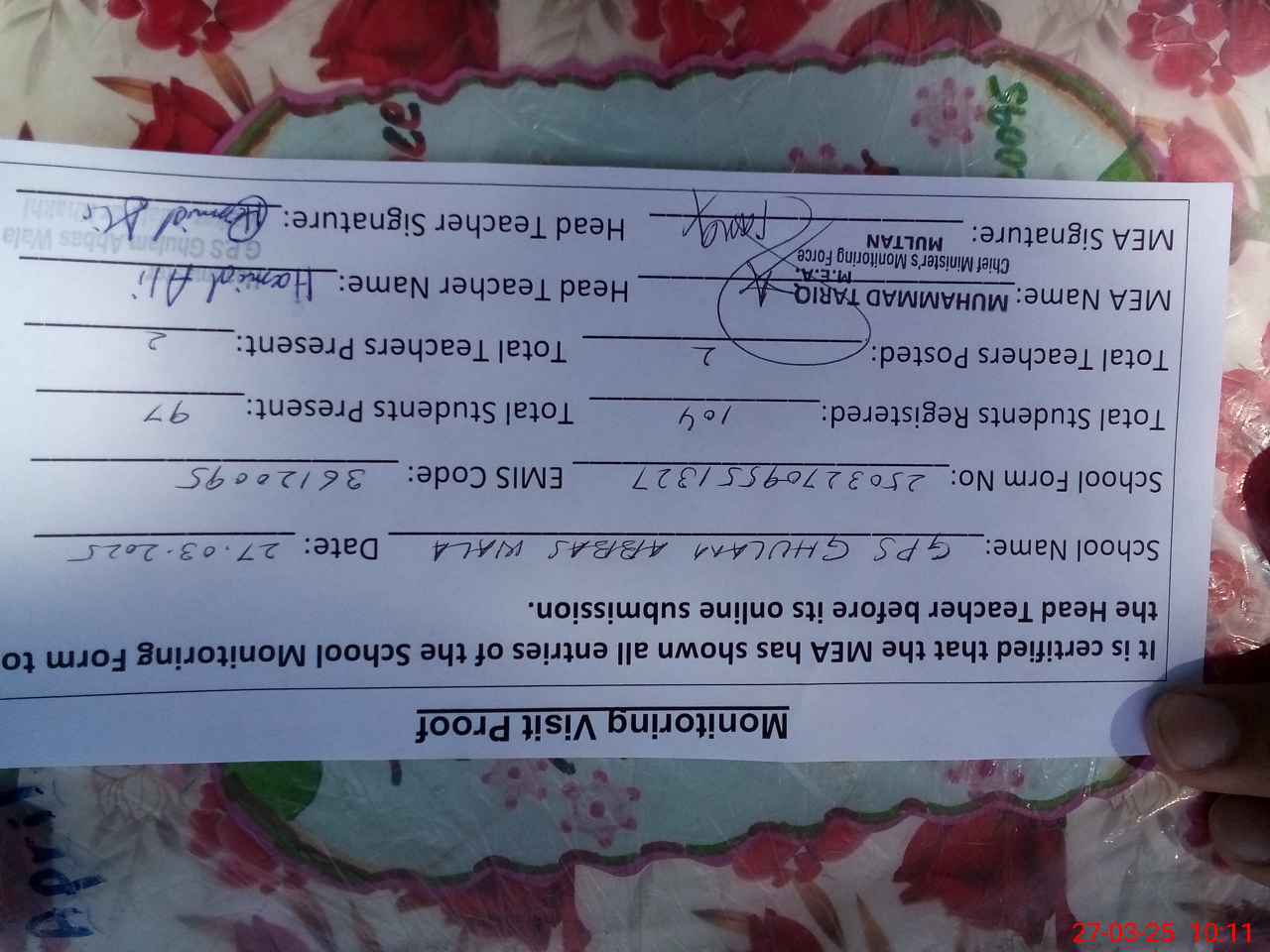 | Attendance Register | Head Teacher | MEA with School | Visit Proof |
