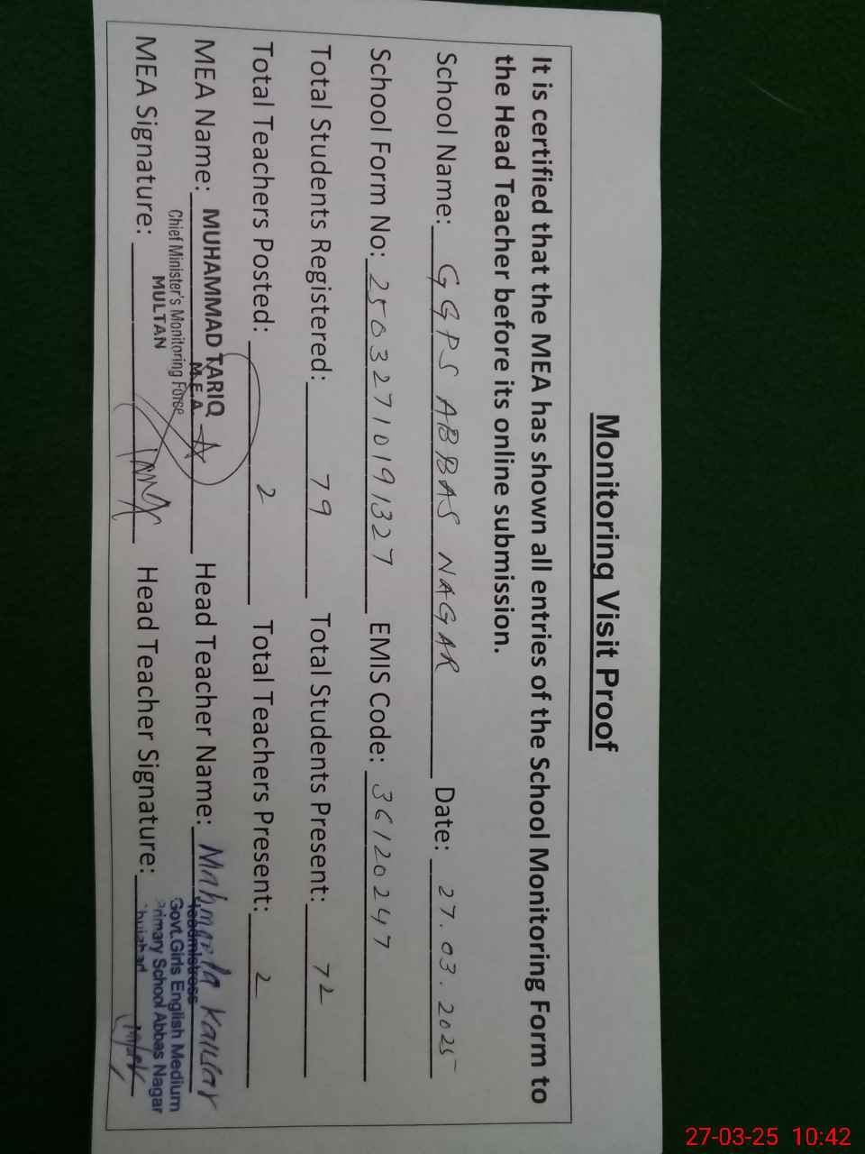 | EMIS Code: 36120247 | Name of School: GGPS ABBAS NAGAR MUZA JALALPUR KHAKHI | |||