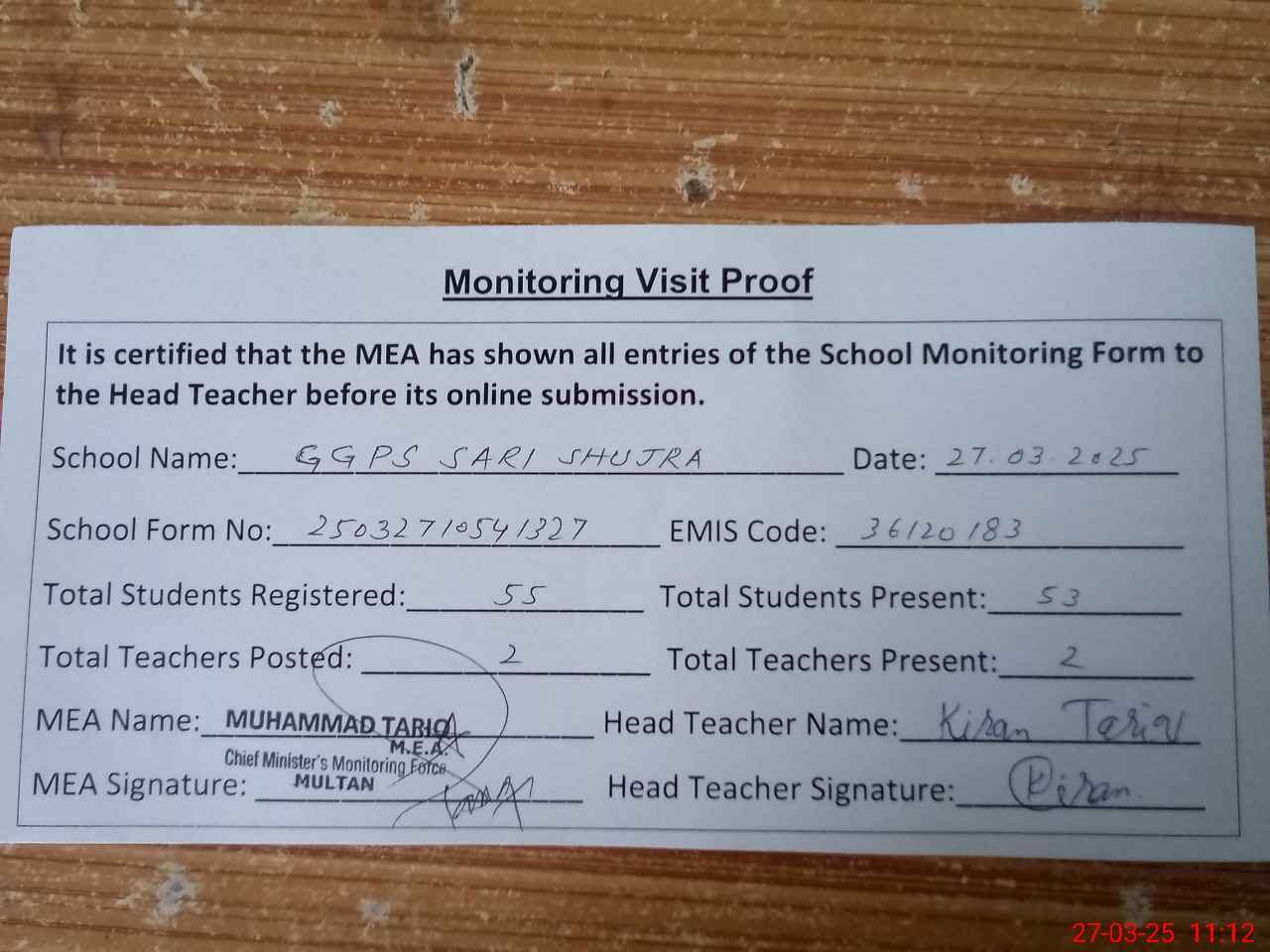 | Attendance Register | Head Teacher | MEA with School | Visit Proof |