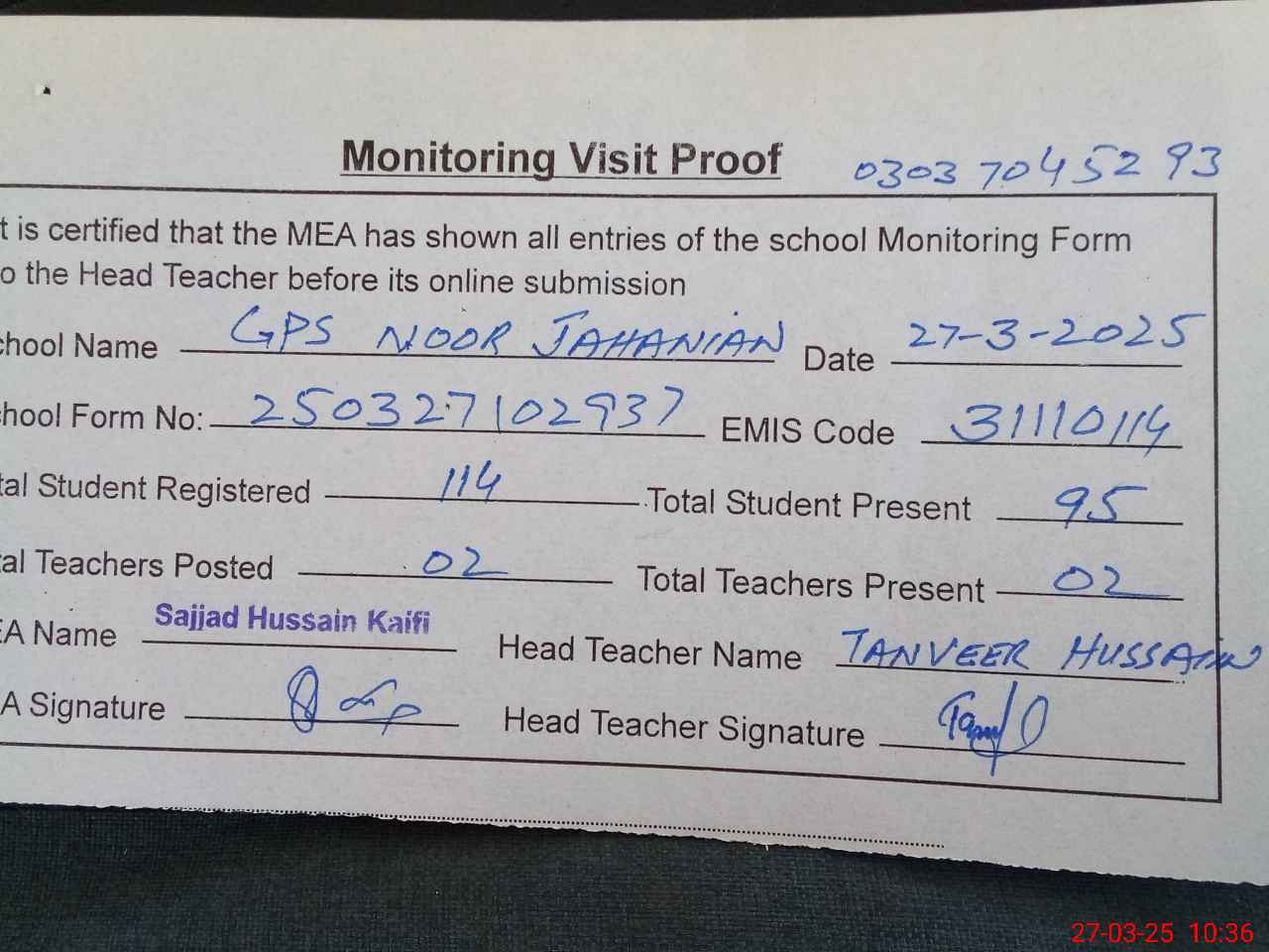 | EMIS Code: 31110114 | Name of School: GPS NOOR JAHANIAN | |||