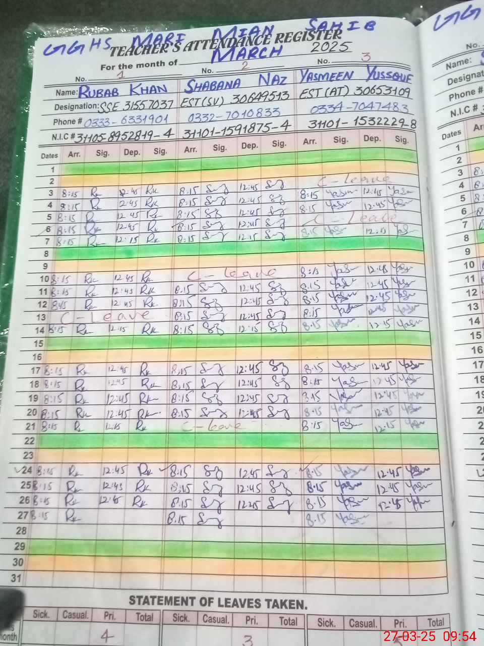 | CNIC | Full Name | Designation | R/C | Absence During Last Calender Month |