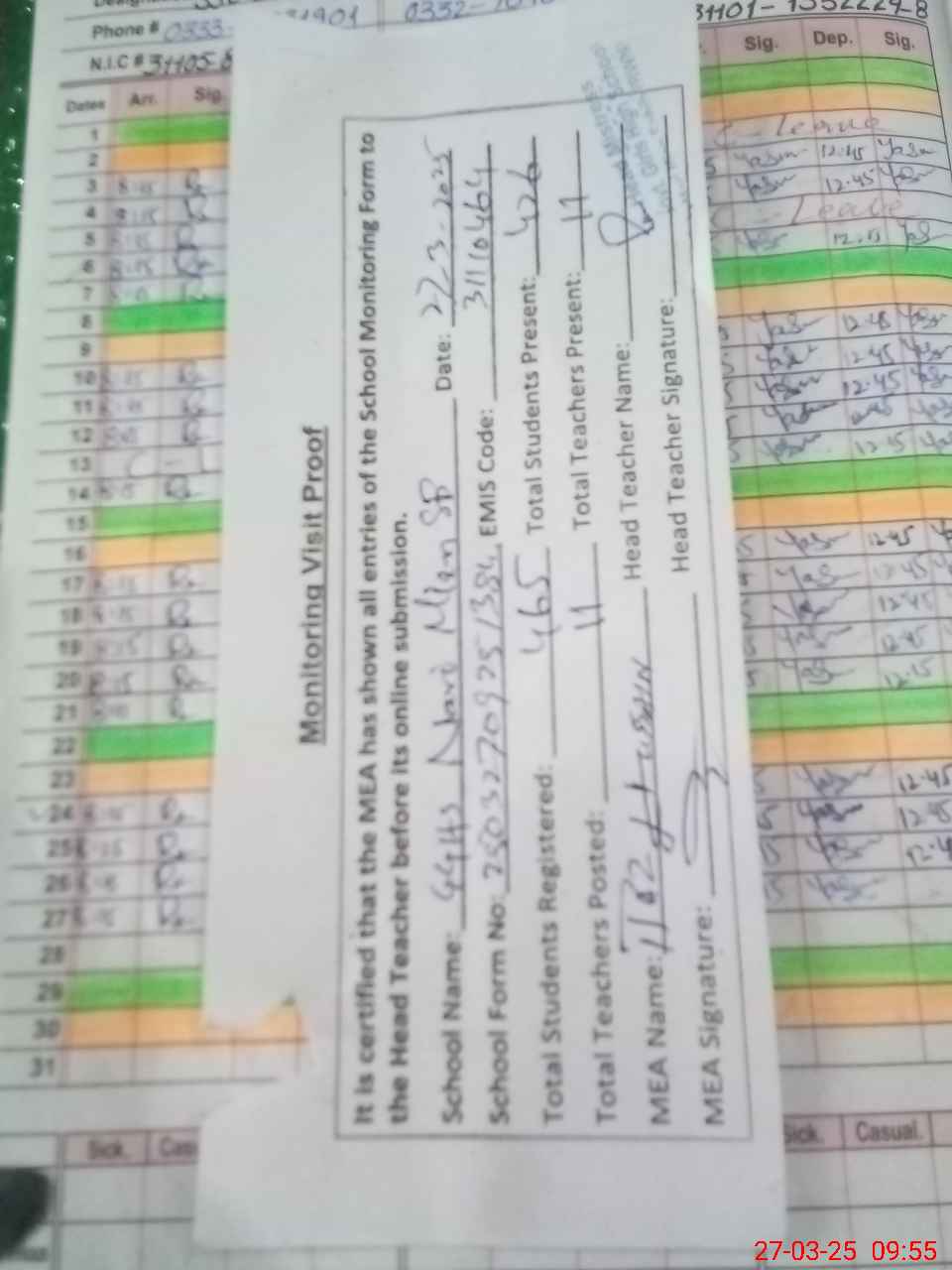 | Attendance Register | Head Teacher | MEA with School | Visit Proof |