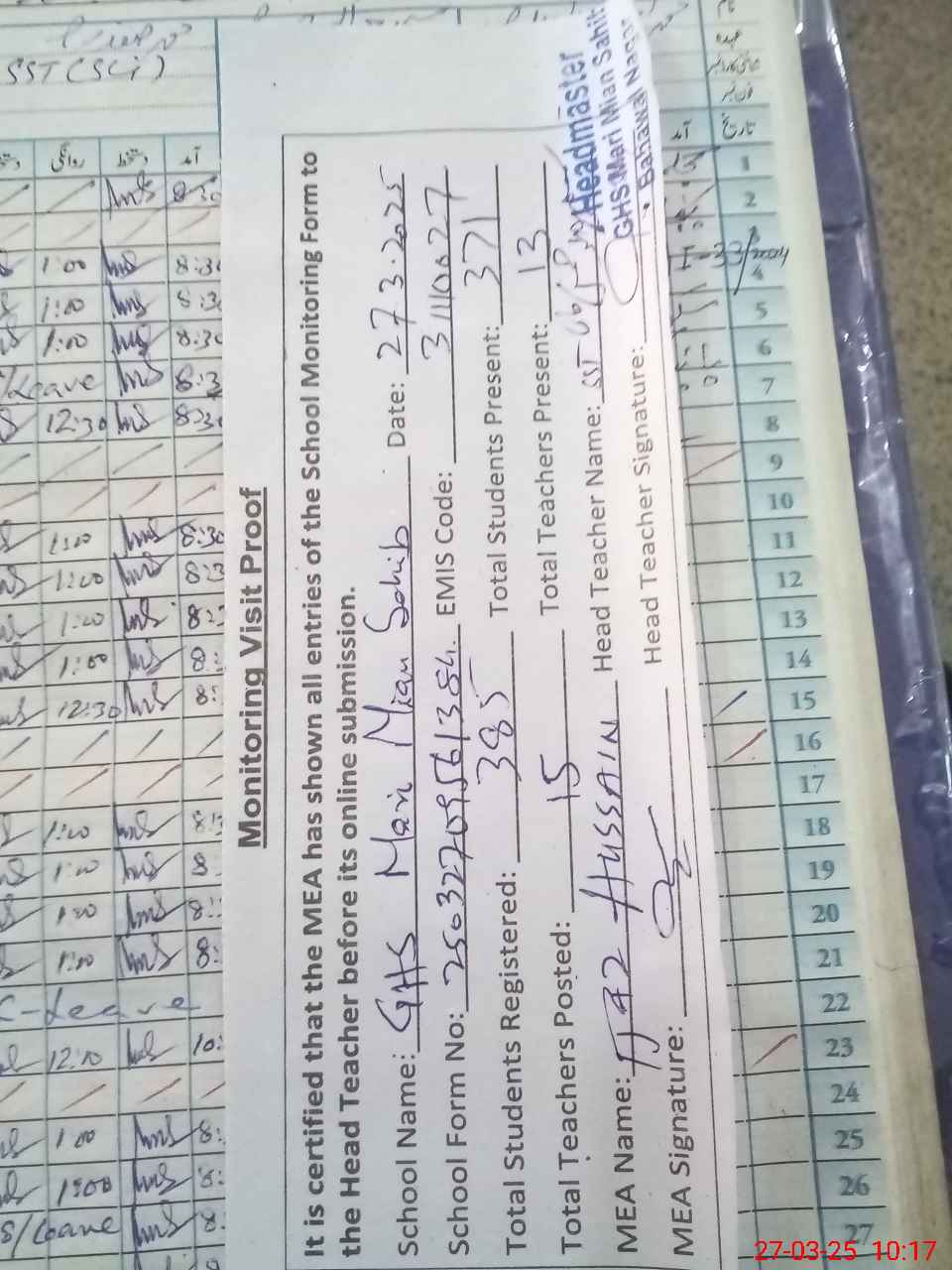 | Attendance Register | Head Teacher | MEA with School | Visit Proof |
