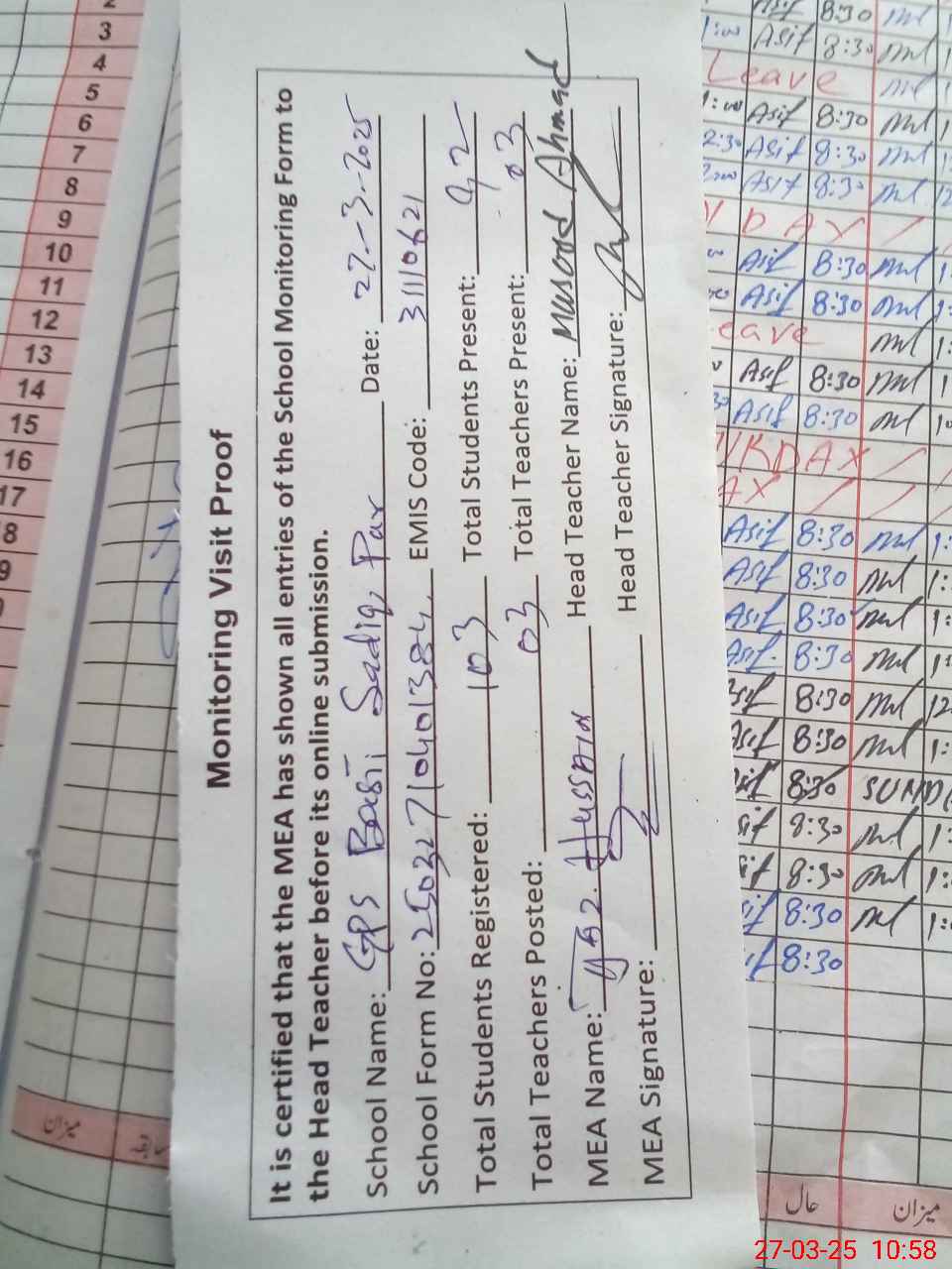 | Attendance Register | Head Teacher | MEA with School | Visit Proof |