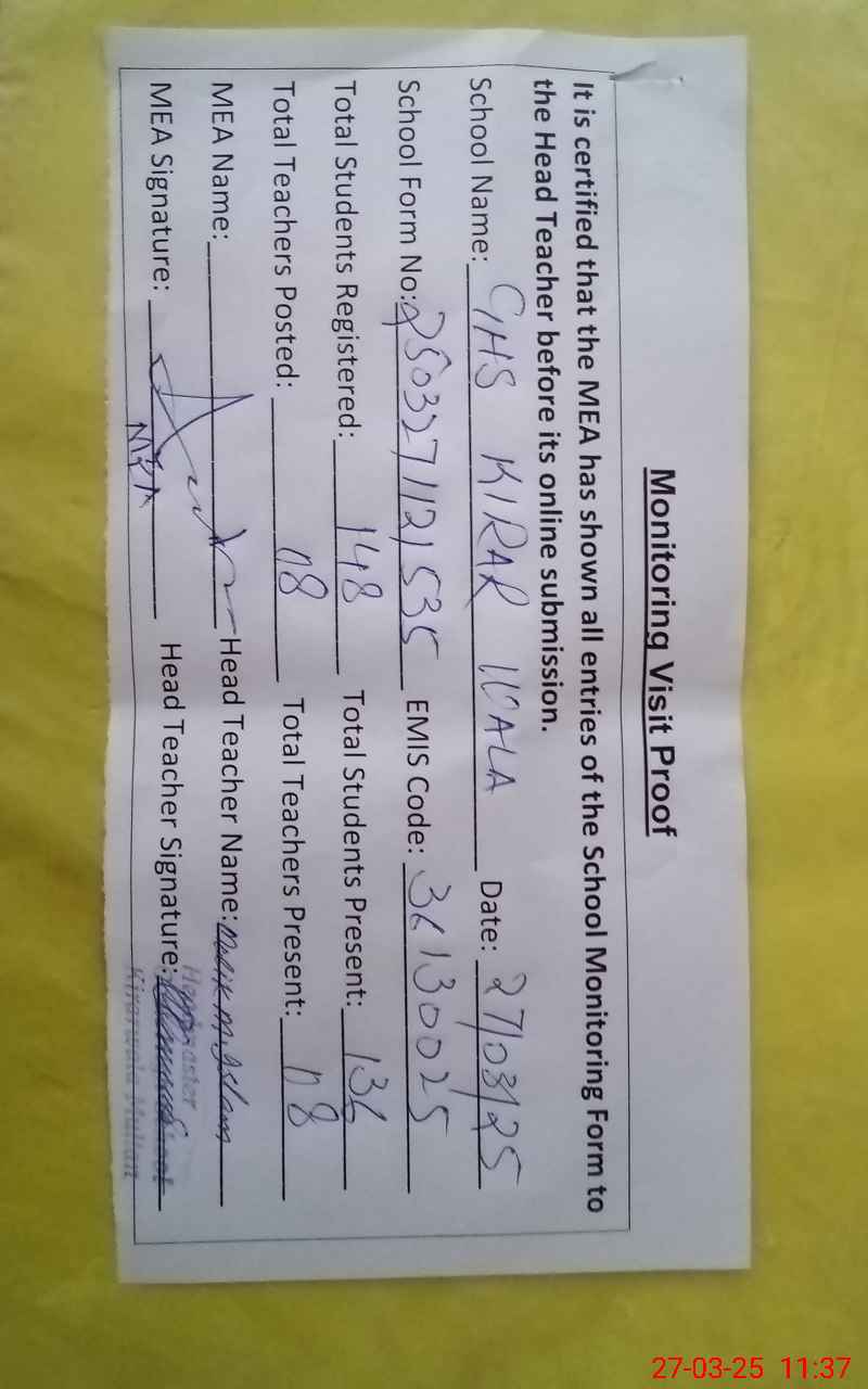 | Attendance Register | Head Teacher | MEA with School | Visit Proof |