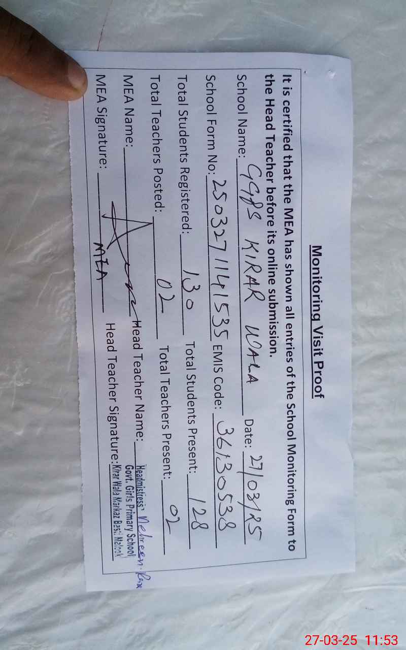 | EMIS Code: 36130538 | Name of School: GGPS KIRAR WALA | |||