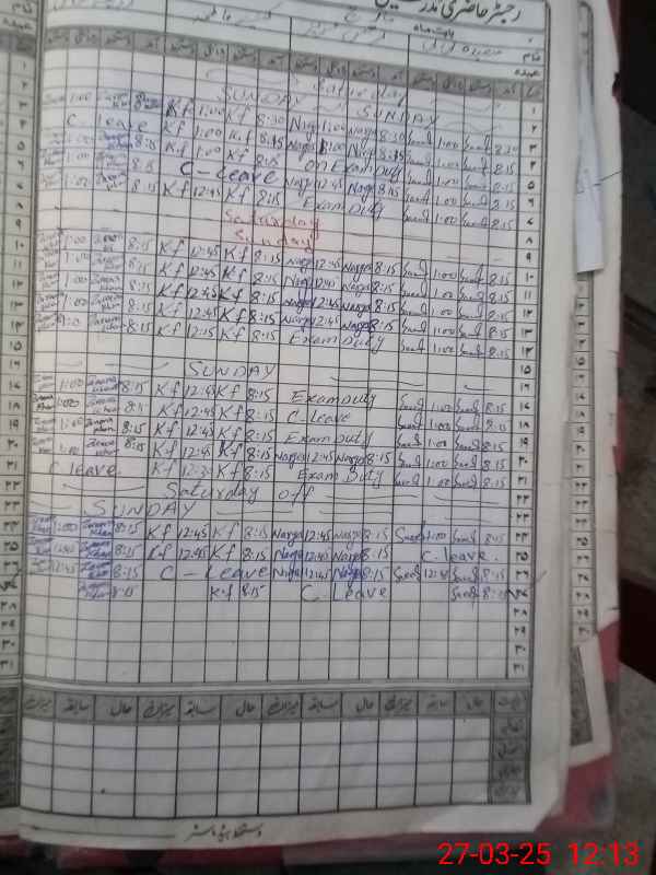 | CNIC | Full Name | Designation | R/C | Absence During Last Calender Month |