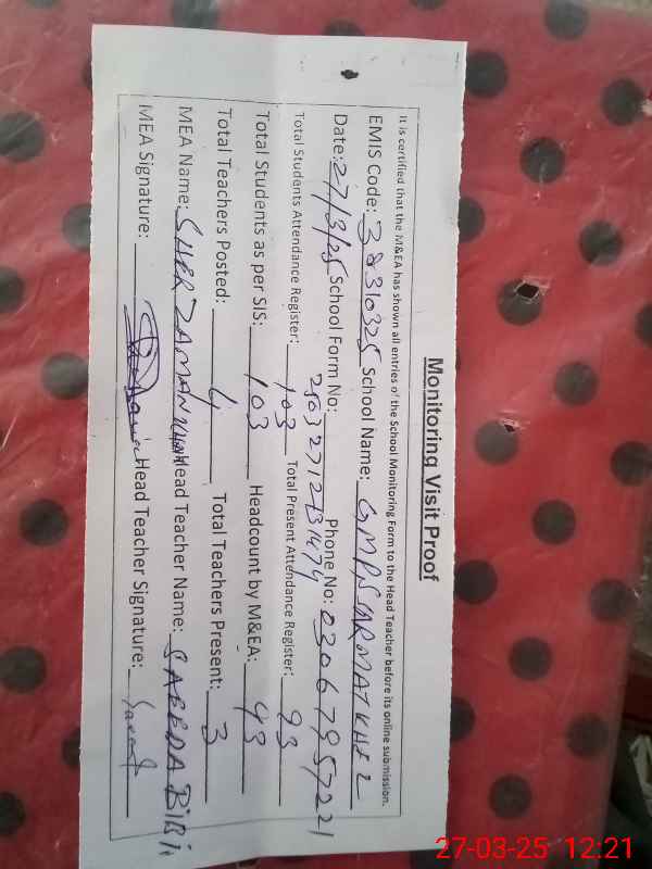| EMIS Code: 38310325 | Name of School: GMPS SARMAT KHEL | |||