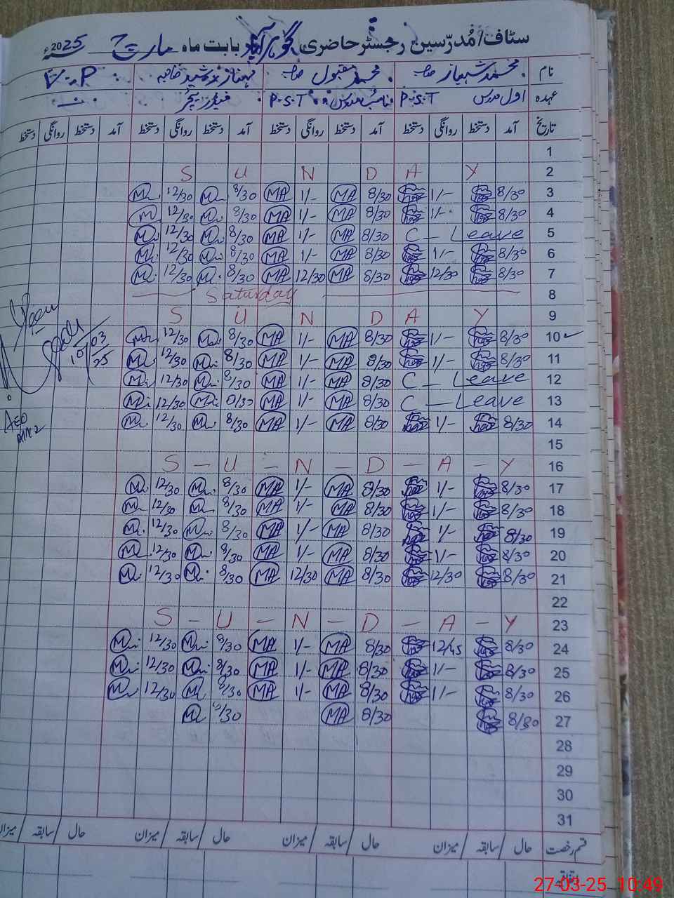 | Name: MU**** SH**** Designation: (School Headmaster's/Headmistress's) PST Phone/Cell Number: 03**** |