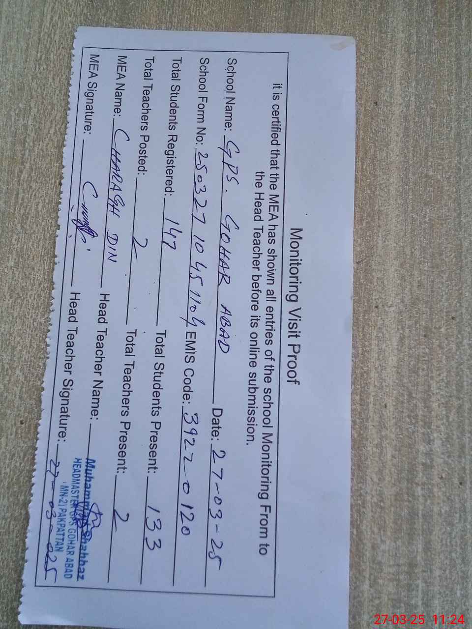 | Attendance Register | Head Teacher | MEA with School | Visit Proof |