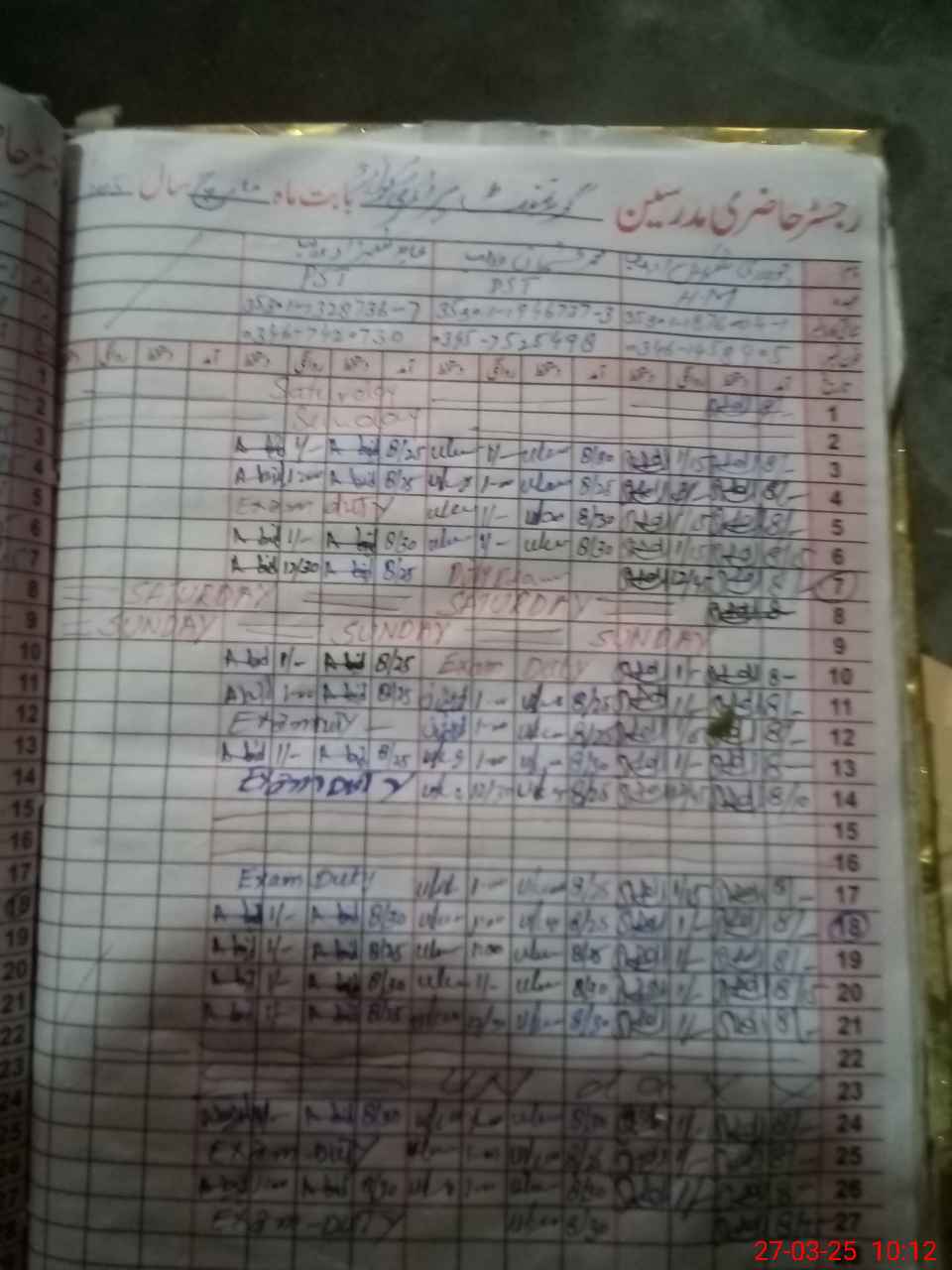 | 35**** | Ab**** Sh**** | 2 | 2 | 0 | 0 | 0 | 0 | 0 | 0 | 0 | 0 | 0 | Exam Duty |
