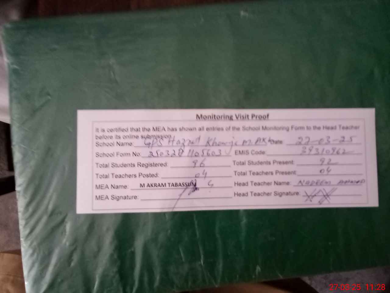 | Attendance Register | Head Teacher | MEA with School | Visit Proof |