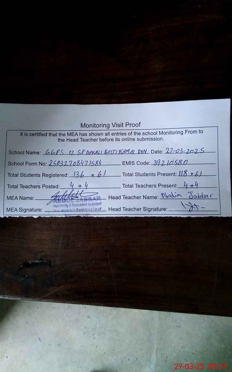| EMIS Code: 39210580 | Name of School: GGPS 12 SP DAKHLI (BASTI KAMAL DIN) | |||