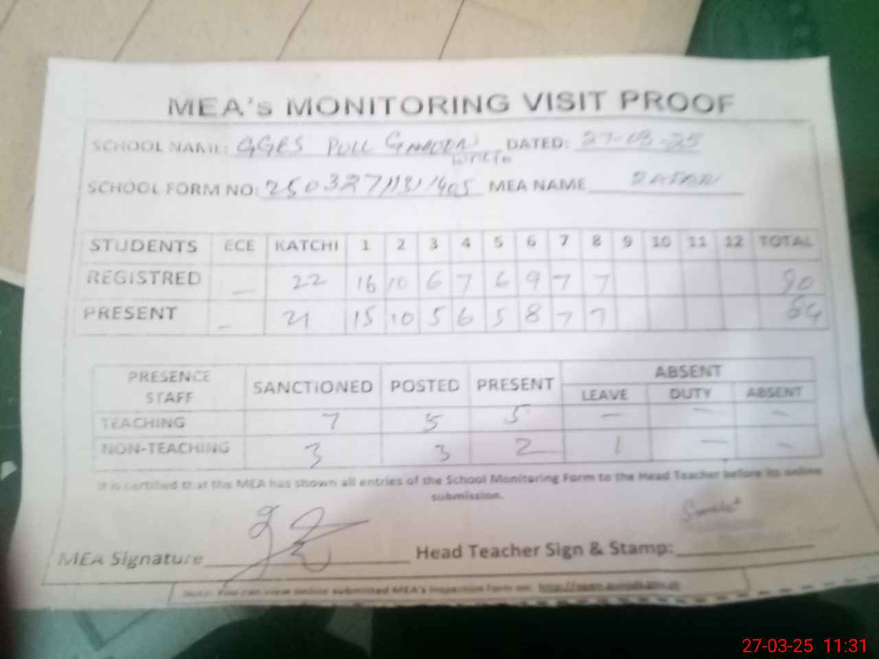 | Attendance Register | Head Teacher | MEA with School | Visit Proof |