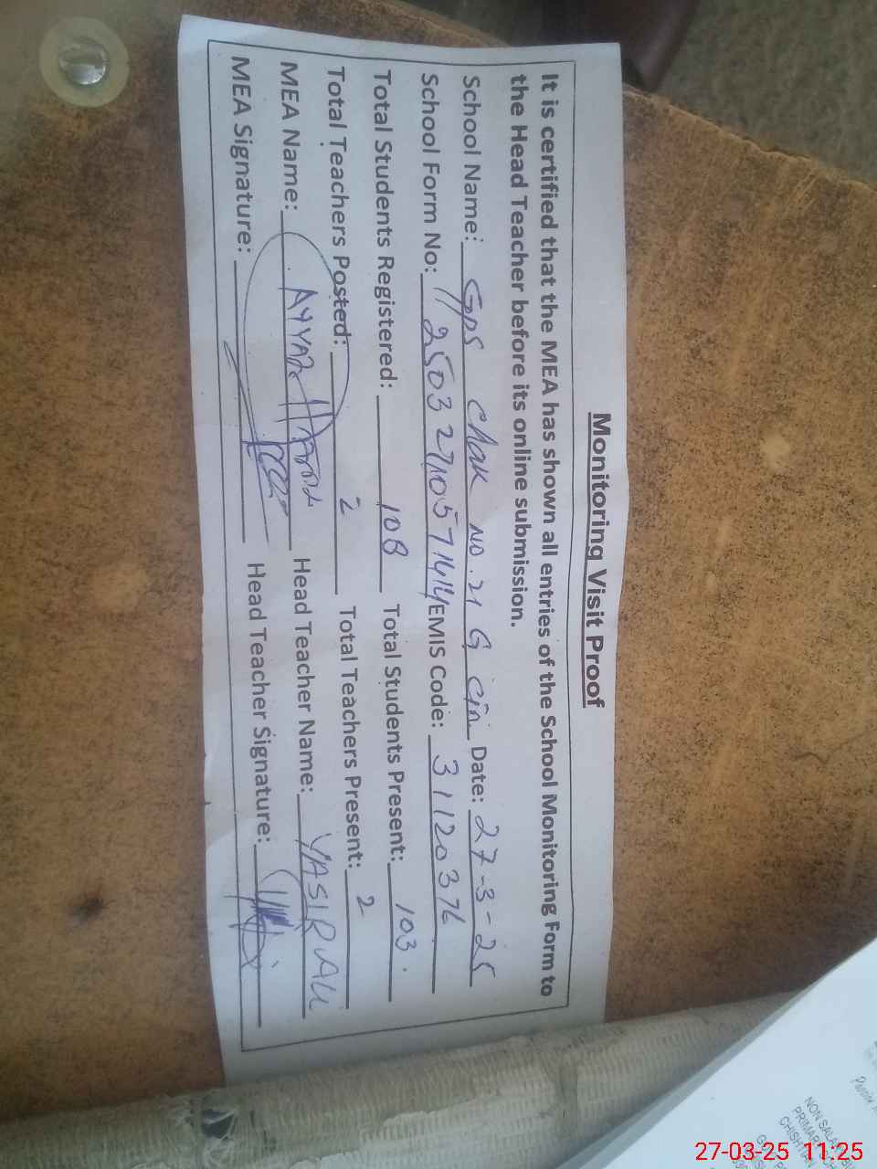 | Attendance Register | Head Teacher | MEA with School | Visit Proof |