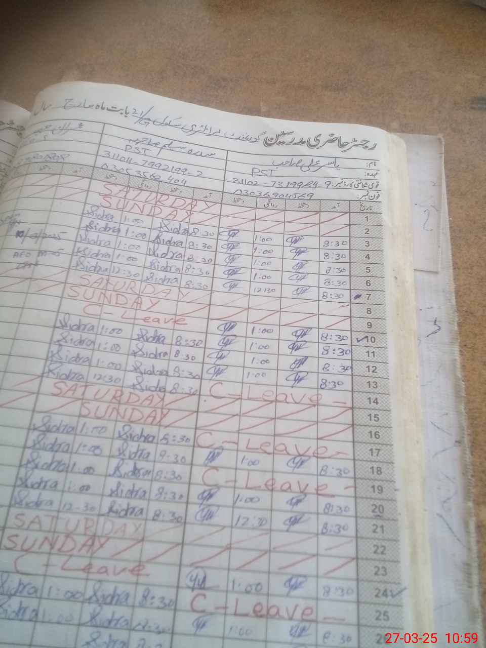 | CNIC | Full Name | Designation | R/C | Absence During Last Calender Month |