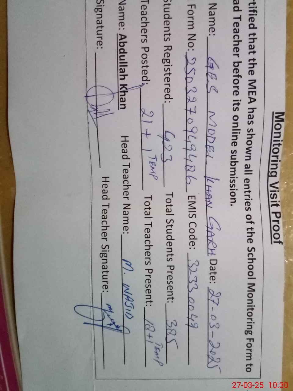 | EMIS Code: 32330049 | Name of School: GES MODEL KHAN GARH | |||