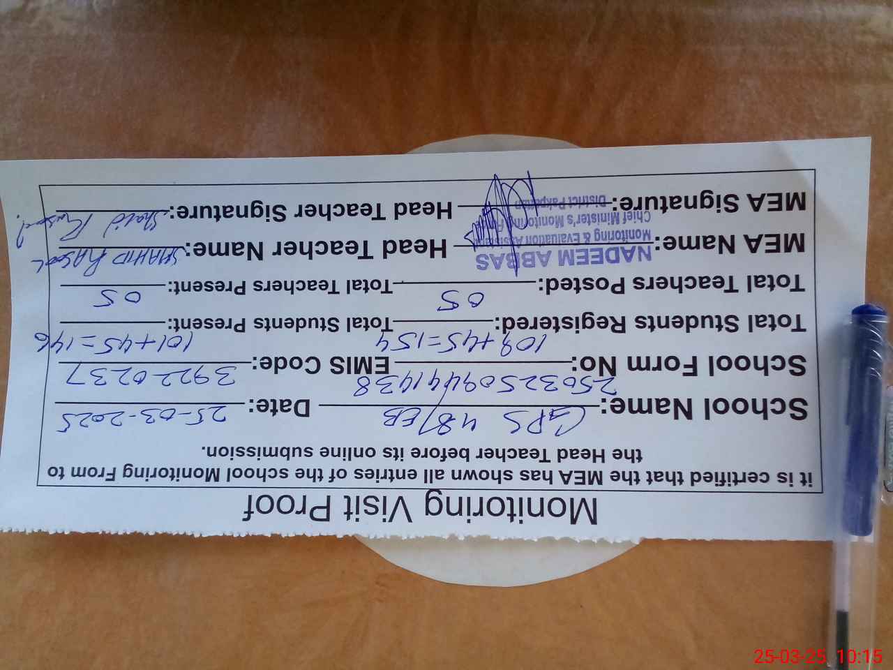 | Certified that this School was Inspected by the Undersigned MEA/DMO Today and the Information Stated Above is as Per Record. | |||||