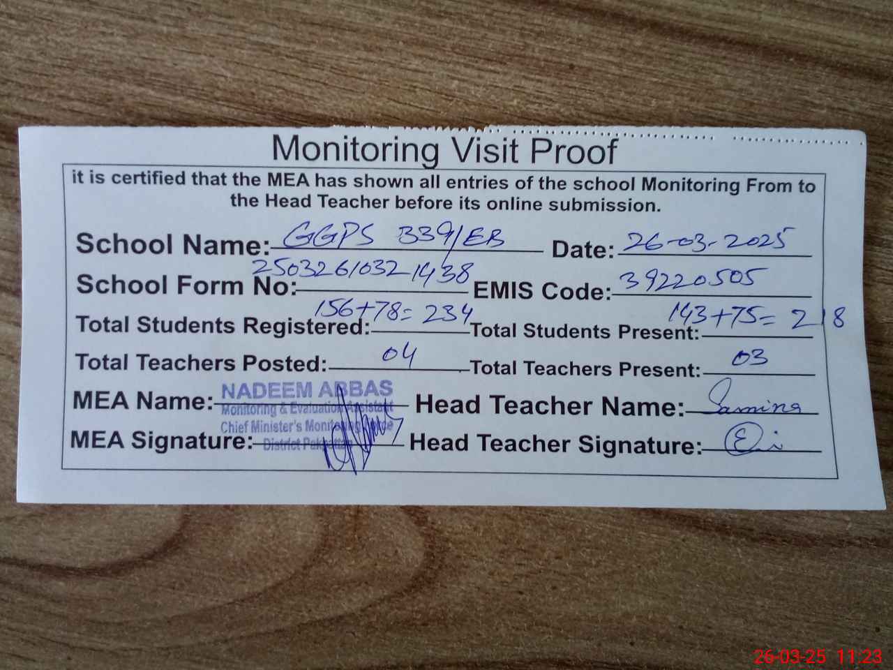 | Attendance Register | Head Teacher | MEA with School | Visit Proof |