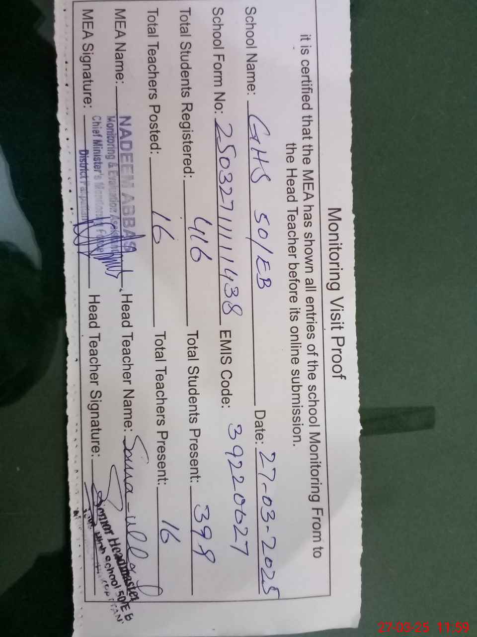 | Attendance Register | Head Teacher | MEA with School | Visit Proof |