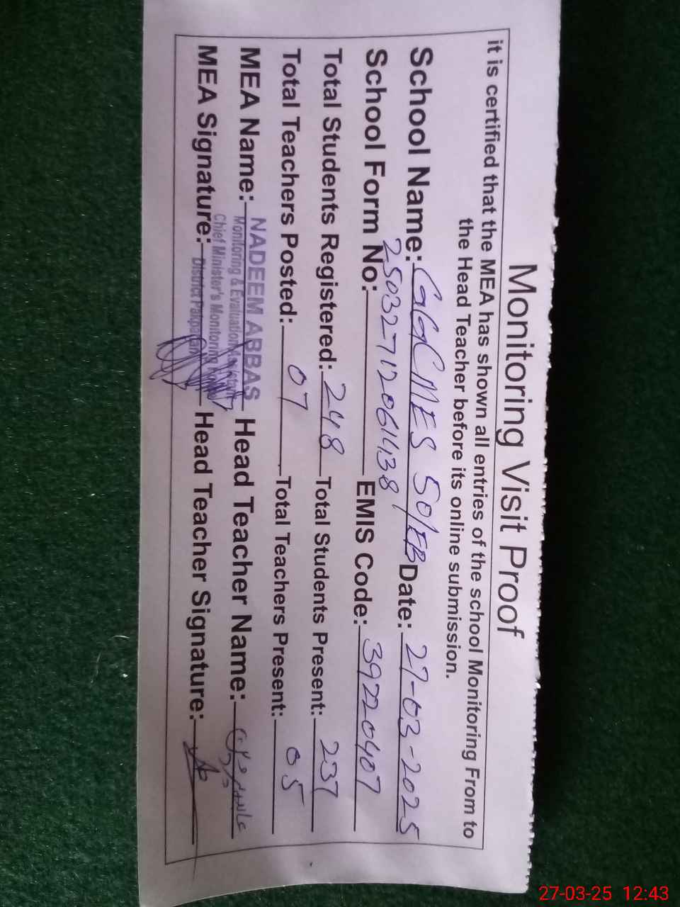 | Attendance Register | Head Teacher | MEA with School | Visit Proof |