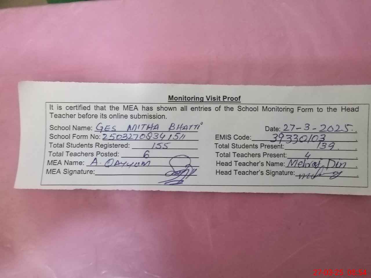 | EMIS Code: 39330103 | Name of School: GES MITHA BHATTI | |||