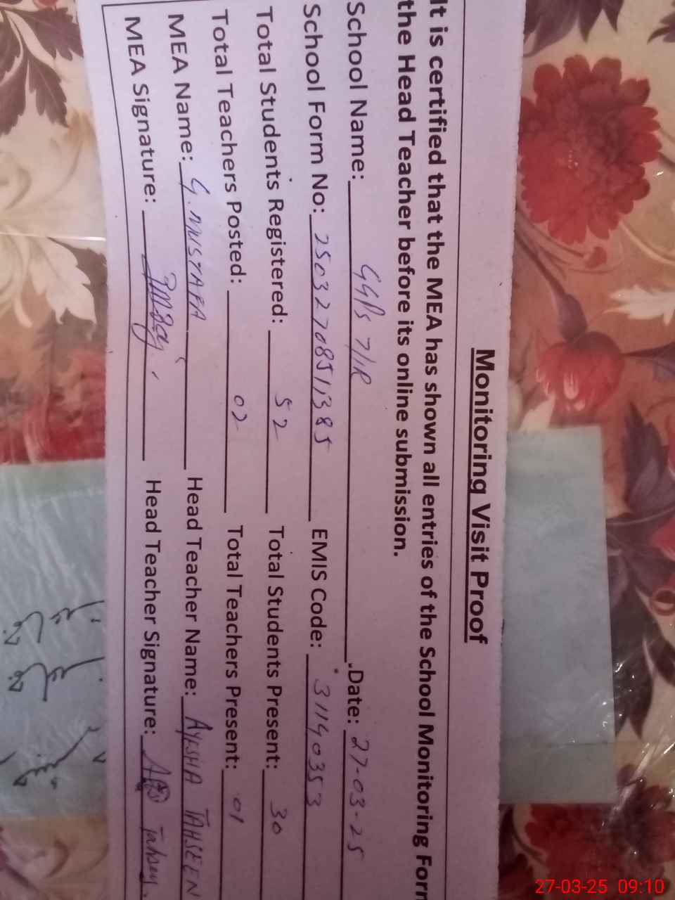 | Attendance Register | Head Teacher | MEA with School | Visit Proof |