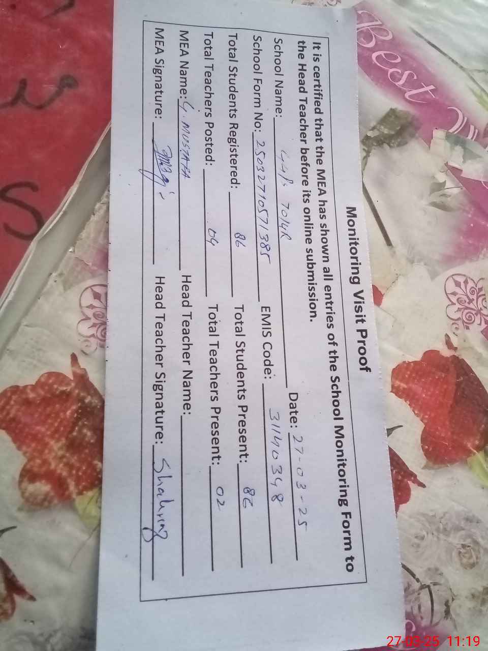 | Remarks (Use Separate Page if Required): Sir all students have completed their exams and there is no student physically at school Present students have recorded from ROZNAMCHA as the instructions of DMO office | |||||
