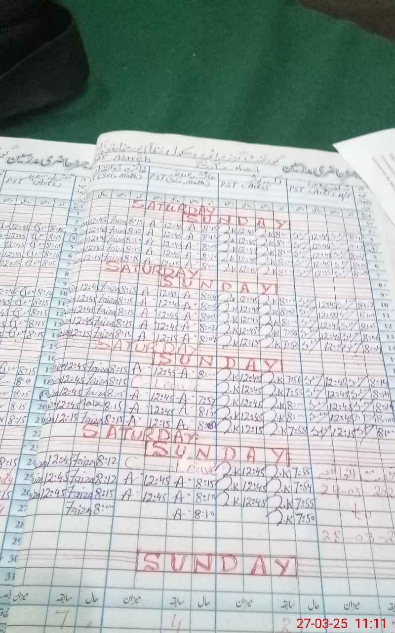 | 35**** | Ta**** Sa**** | 1 | 1 | 0 | 0 | 0 | 0 | 0 | 0 | 0 | 0 | 0 | Exam Duty |