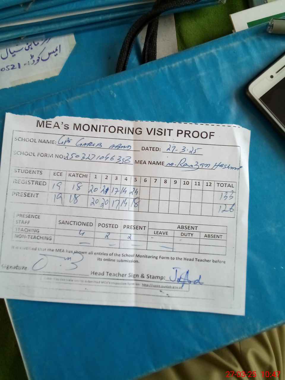 | Attendance Register | Head Teacher | MEA with School | Visit Proof |