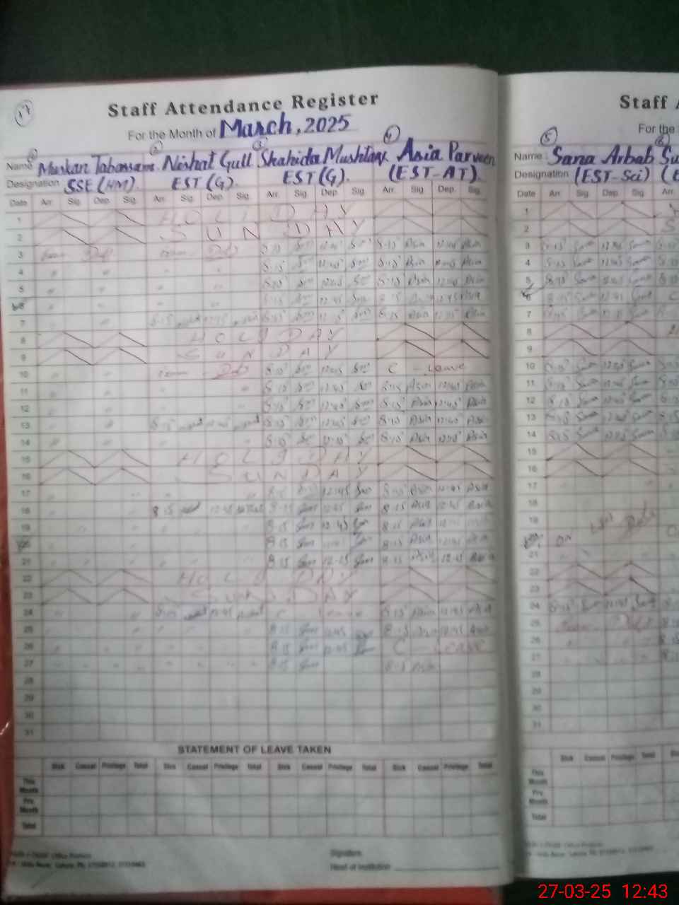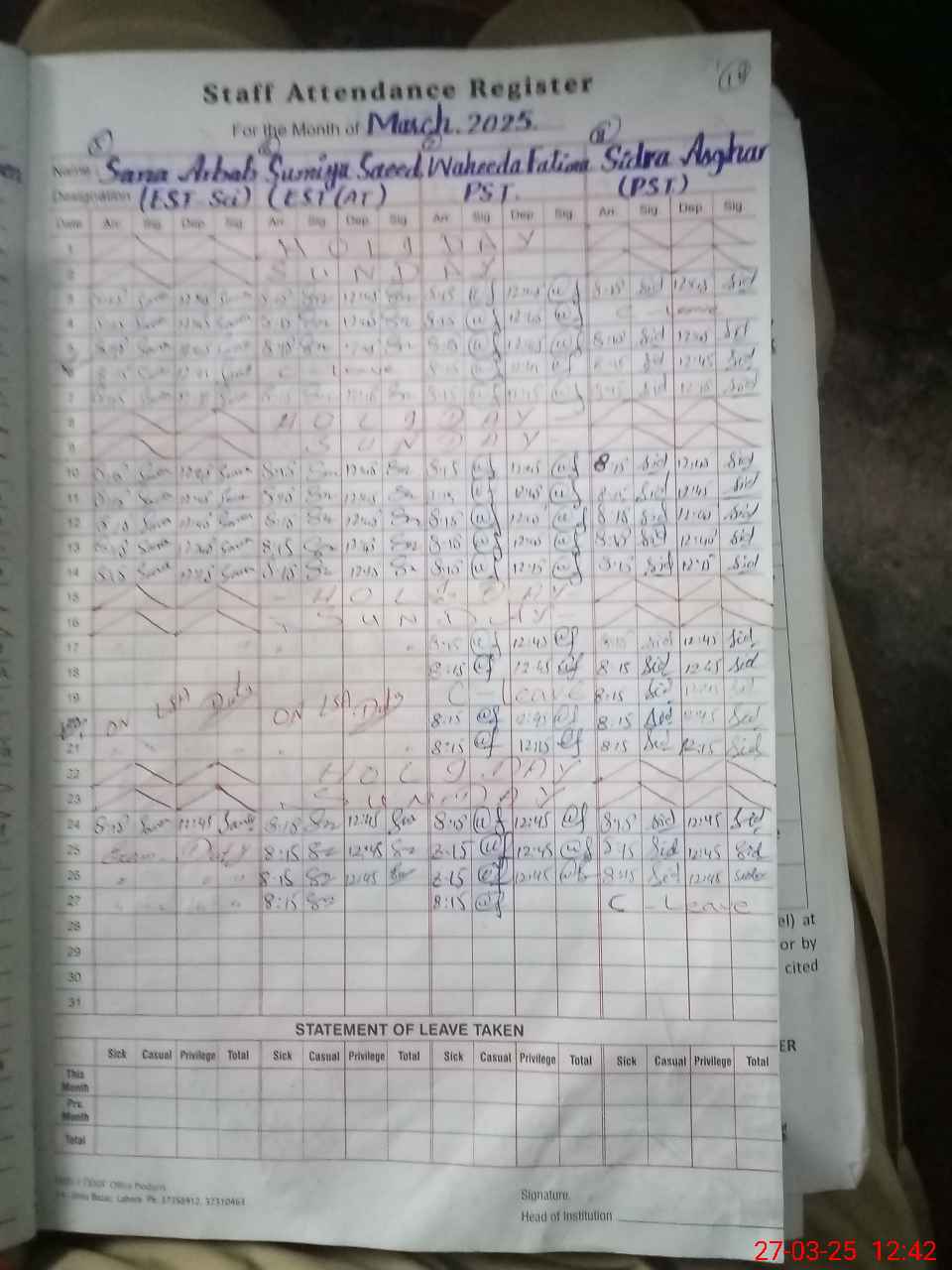 | 35**** | Mu**** Ta**** | 6 | 2 | 0 | 0 | 0 | 0 | 0 | 0 | 0 | 0 | 0 | Exam Duty |