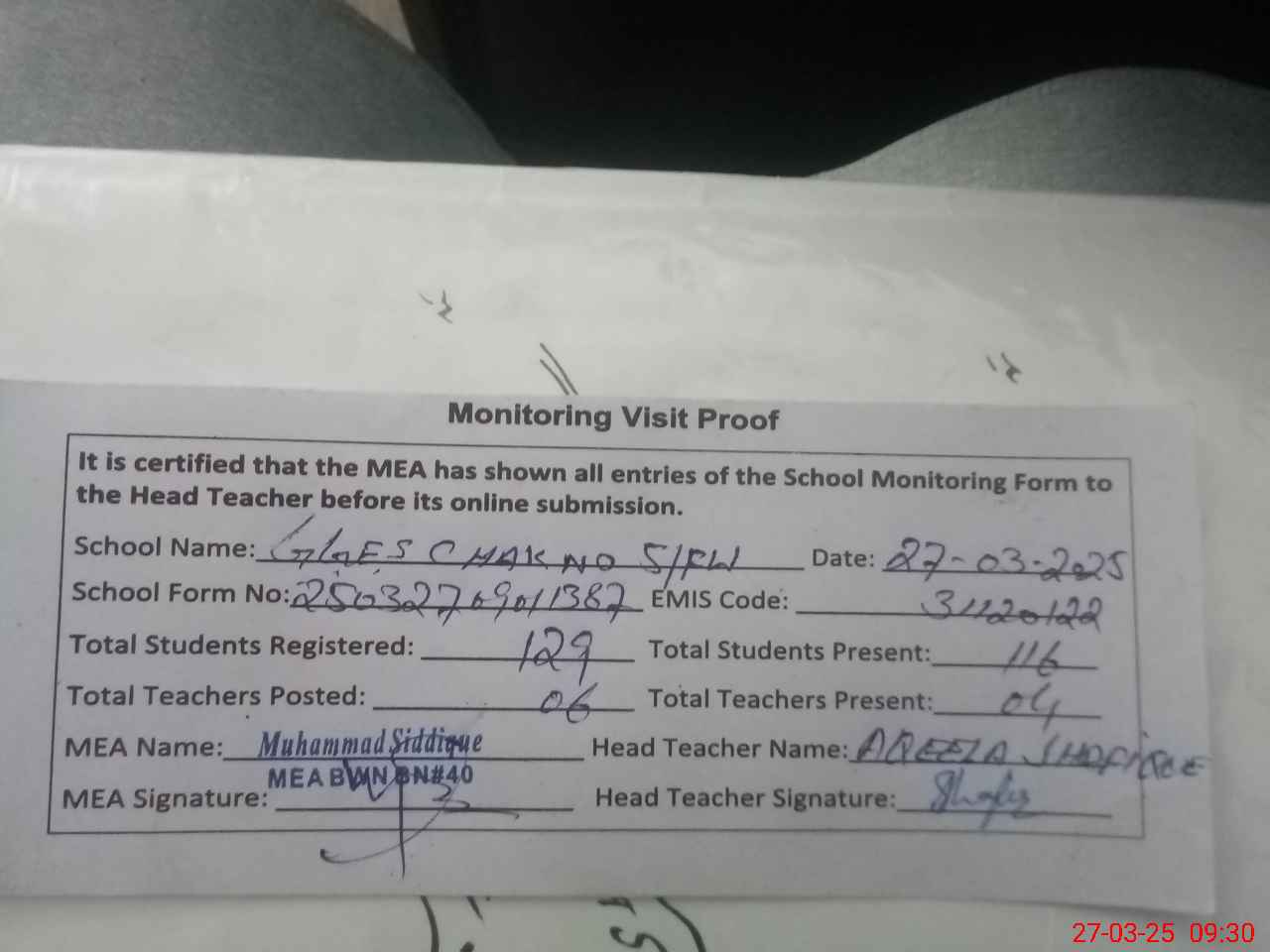 | Attendance Register | Head Teacher | MEA with School | Visit Proof |