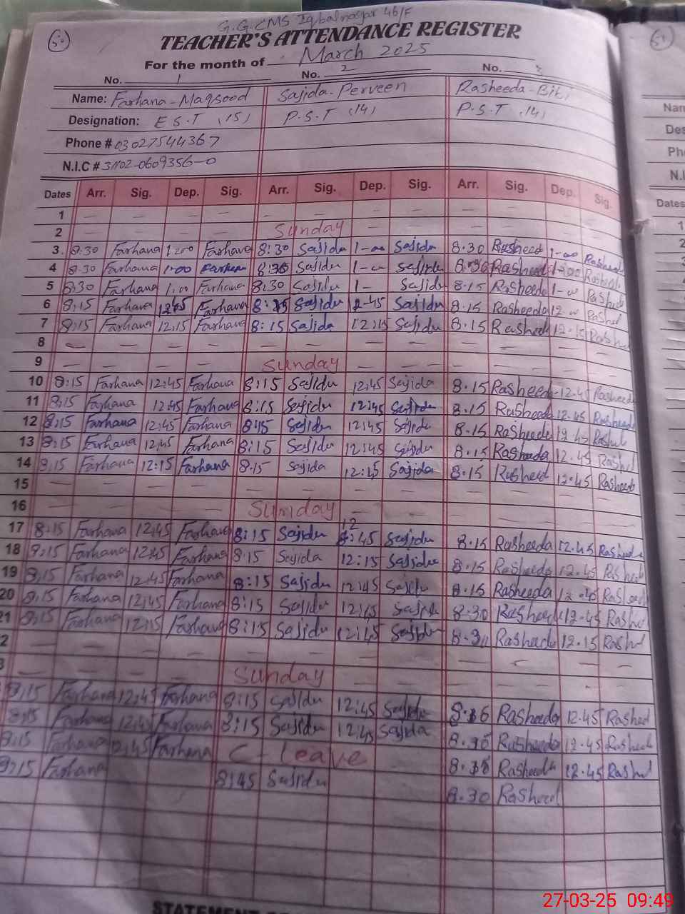 | CNIC | Full Name | Designation | R/C | Absence During Last Calender Month |
