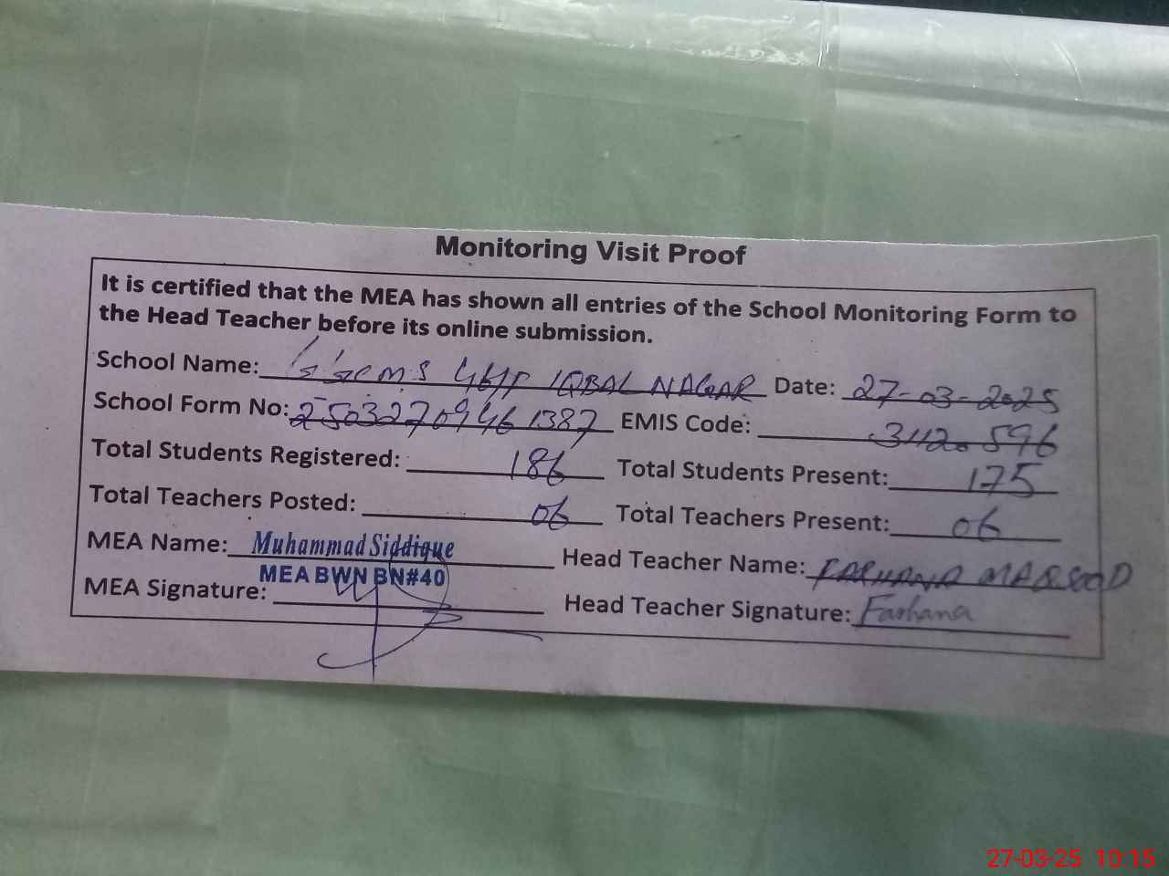 | Certified that this School was Inspected by the Undersigned MEA/DMO Today and the Information Stated Above is as Per Record. | |||||