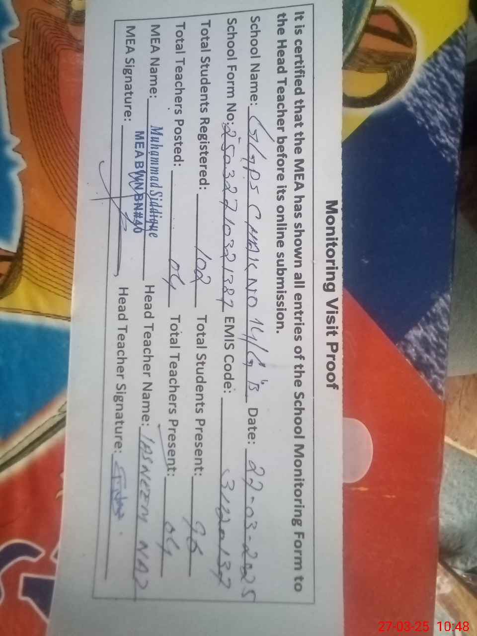 | Attendance Register | Head Teacher | MEA with School | Visit Proof |