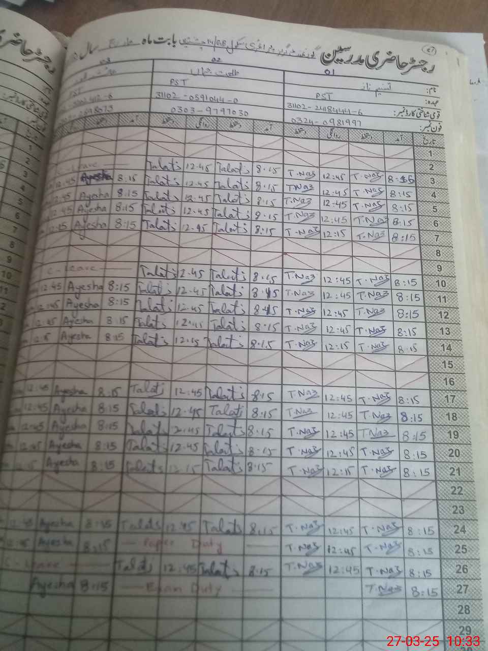 | 31**** | Ta**** Ja**** | PST | Regular | 0 | 0 | 0 | 0 | 0 | 0 | 0 | 0 | 0 | Exam Duty |