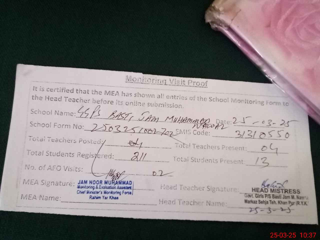 | EMIS Code: 31310550 | Name of School: GGPS BASTI JAM MUHAMMAD NAWAZ | |||
