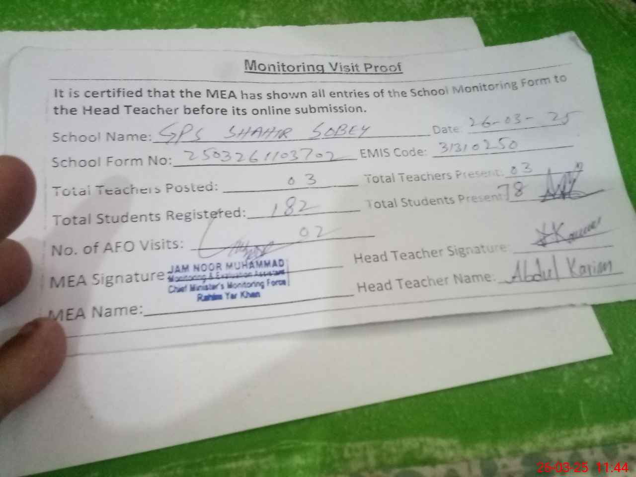 | Attendance Register | Head Teacher | MEA with School | Visit Proof |