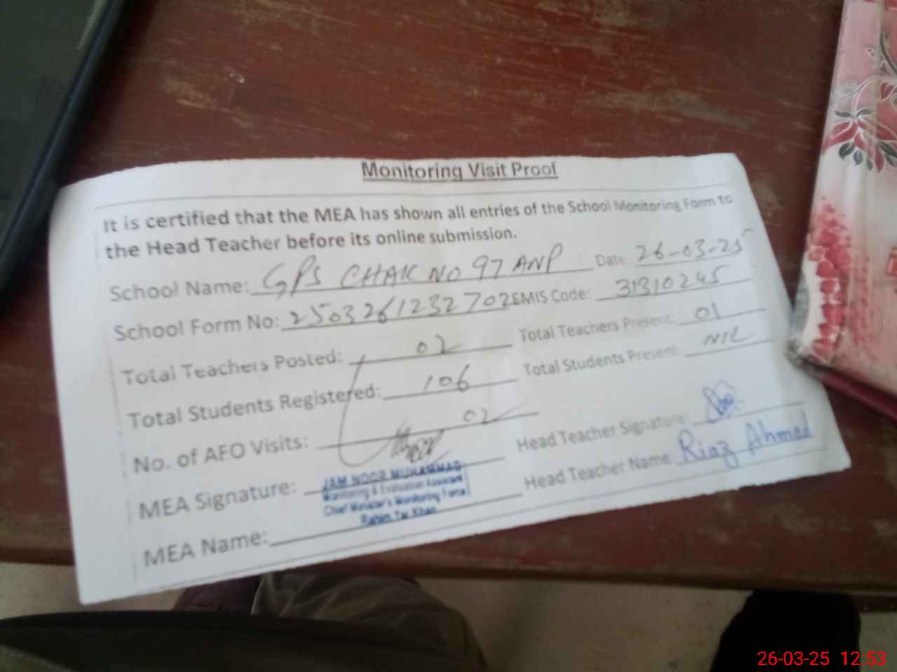 | Attendance Register | Head Teacher | MEA with School | Visit Proof |