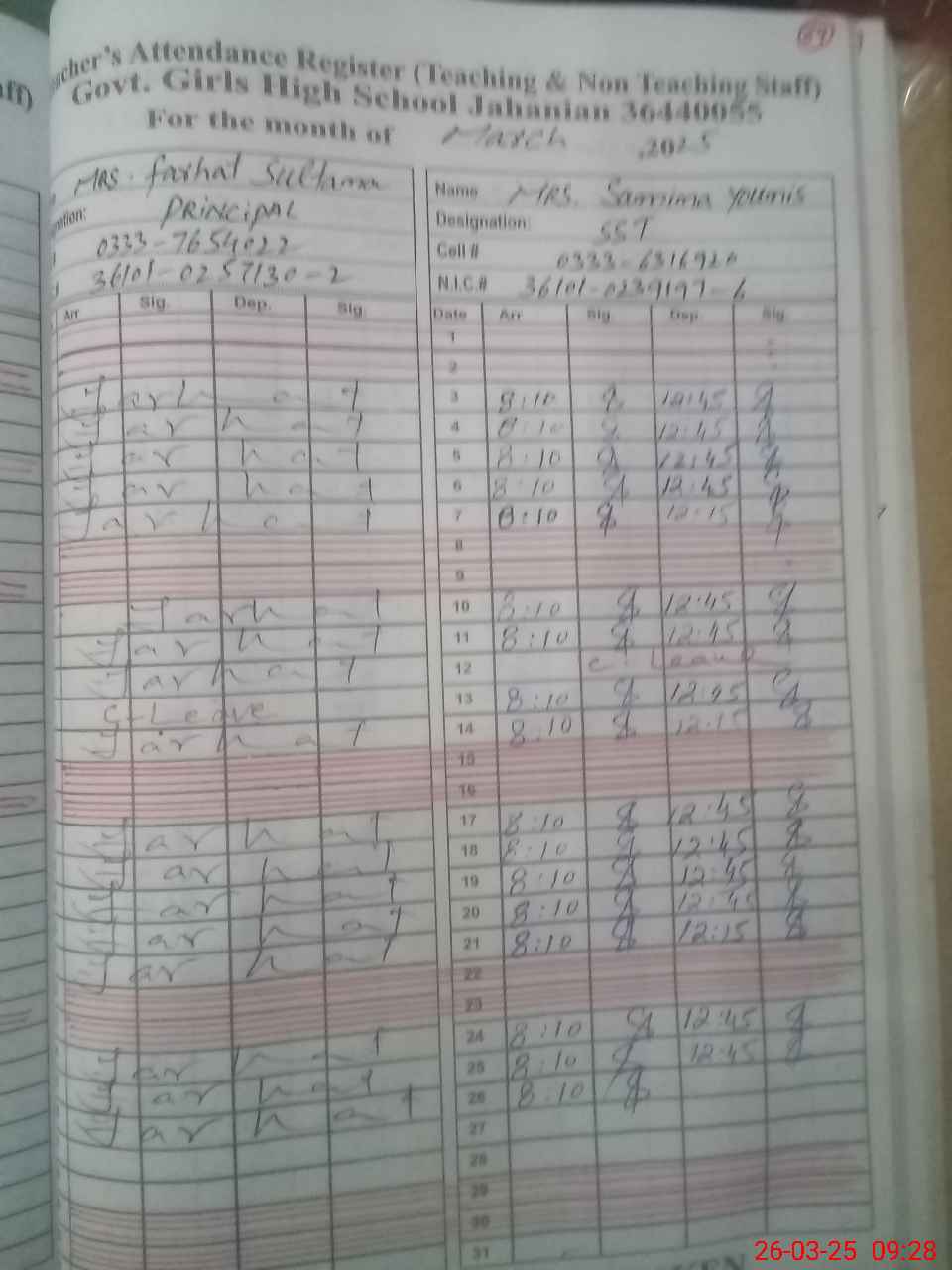 | Name: FA**** SU**** Designation: (School Headmaster's/Headmistress's) PRINCIPAL Phone/Cell Number: 03**** |