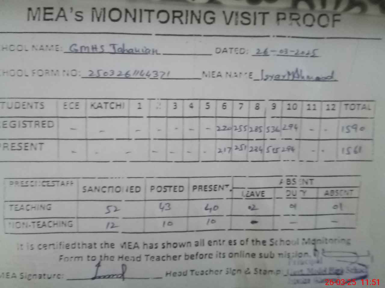 | Certified that this School was Inspected by the Undersigned MEA/DMO Today and the Information Stated Above is as Per Record. | |||||