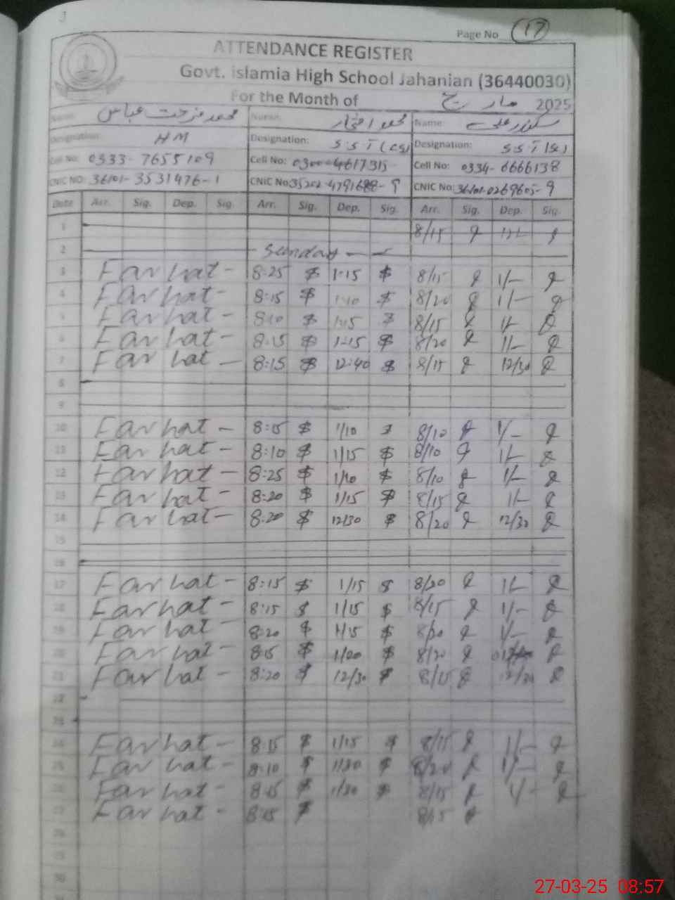 | CNIC | Full Name | Designation | R/C | Absence During Last Calender Month |