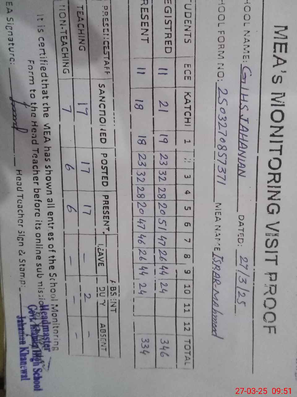 | Attendance Register | Head Teacher | MEA with School | Visit Proof |
