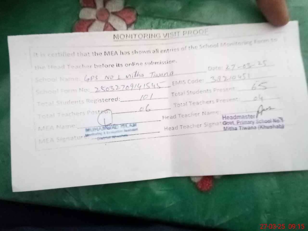 | EMIS Code: 38210451 | Name of School: GPS NO. 1 MITHA TIWANA | |||