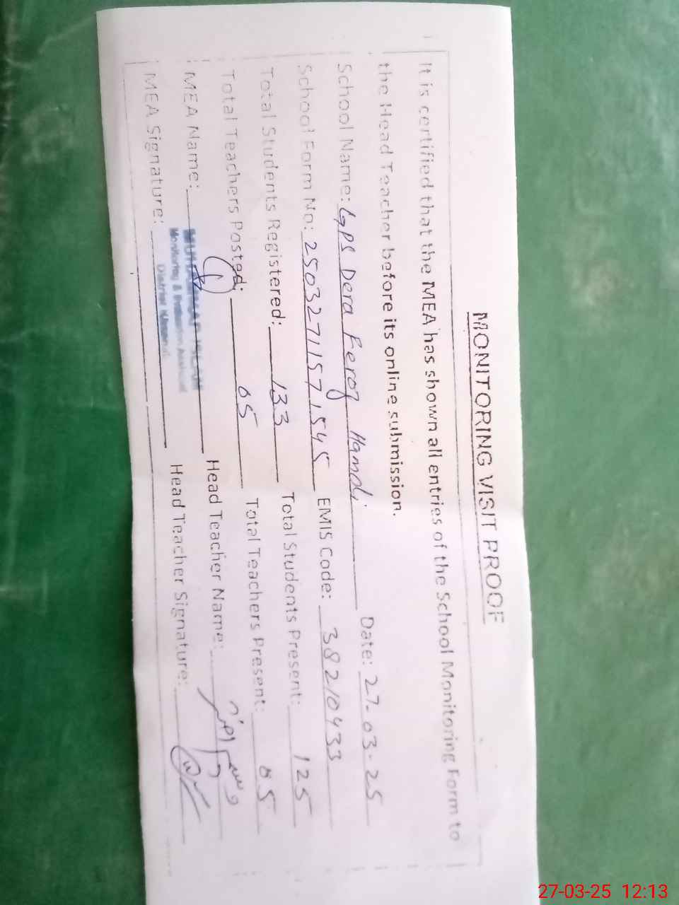 | EMIS Code: 38210433 | Name of School: GPS DERA FEROZ HAMDI | |||