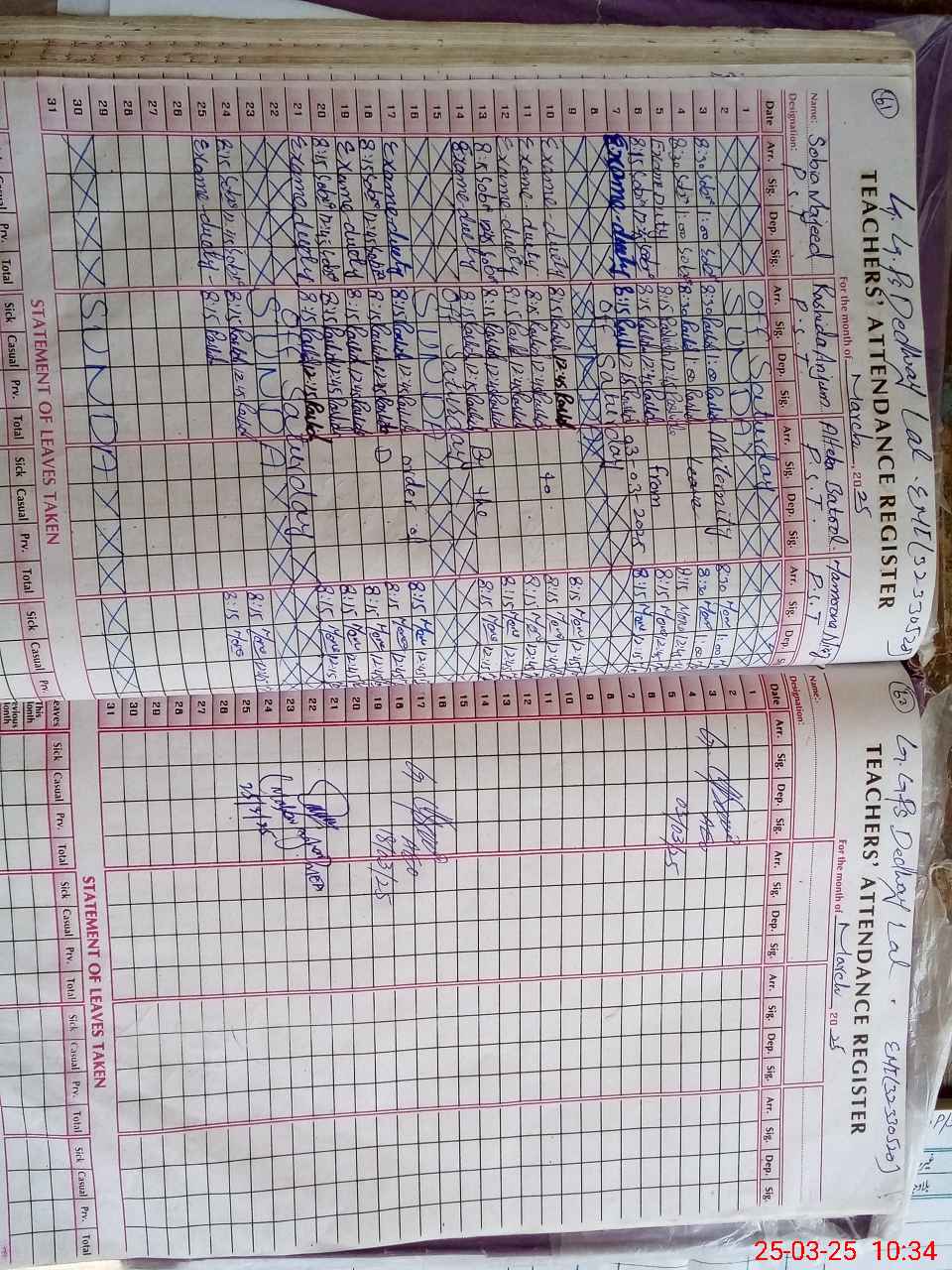 | 32**** | So**** Ma**** | 1 | 1 | 0 | 0 | 0 | 0 | 0 | 0 | 0 | 0 | 0 | Exam Duty |