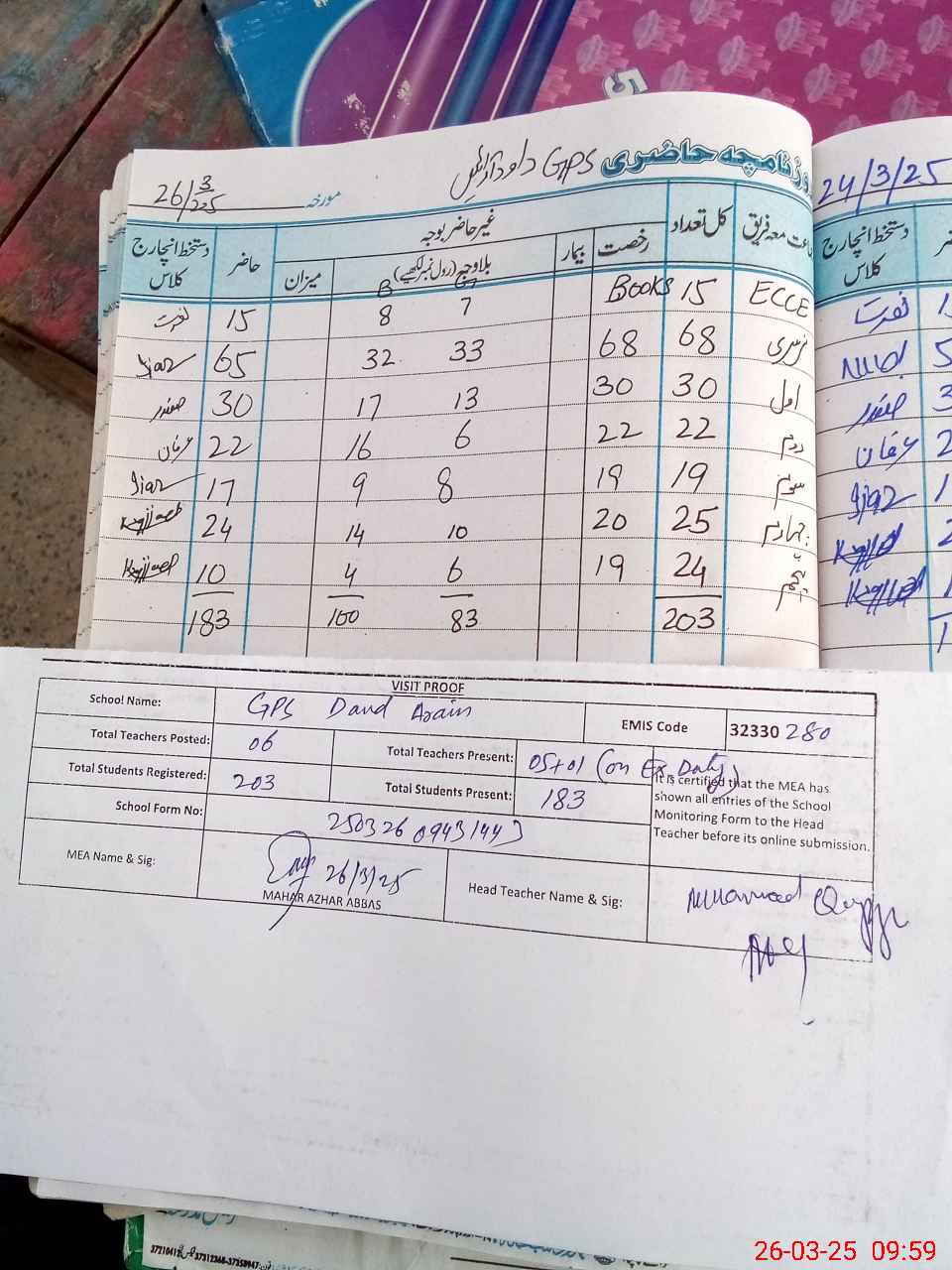 | Attendance Register | Head Teacher | MEA with School | Visit Proof |
