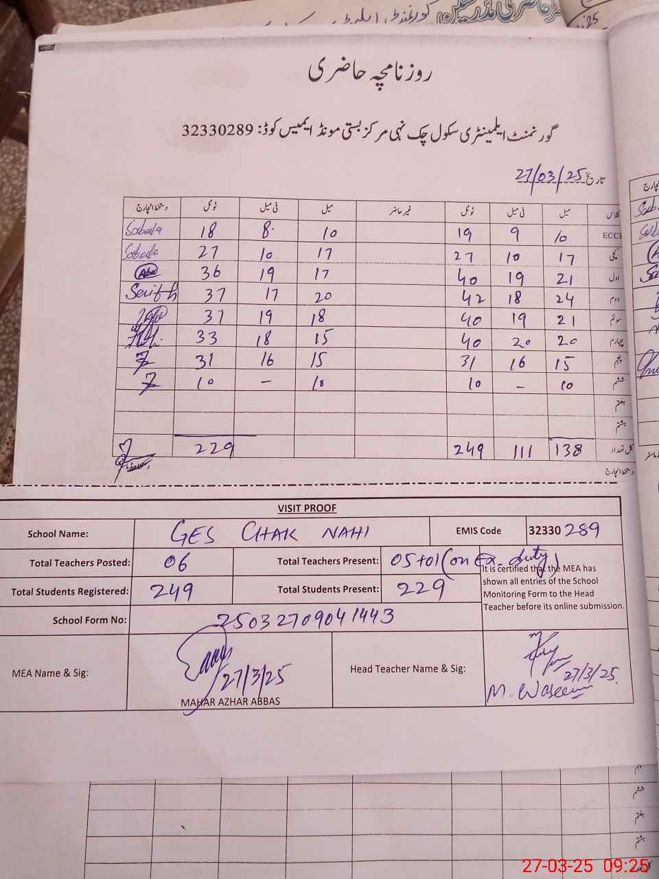 | Attendance Register | Head Teacher | MEA with School | Visit Proof |
