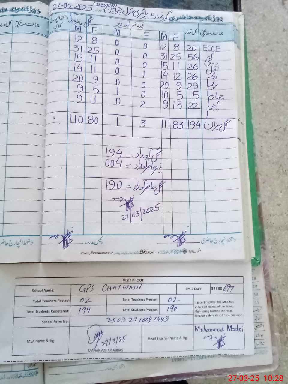 | Attendance Register | Head Teacher | MEA with School | Visit Proof |