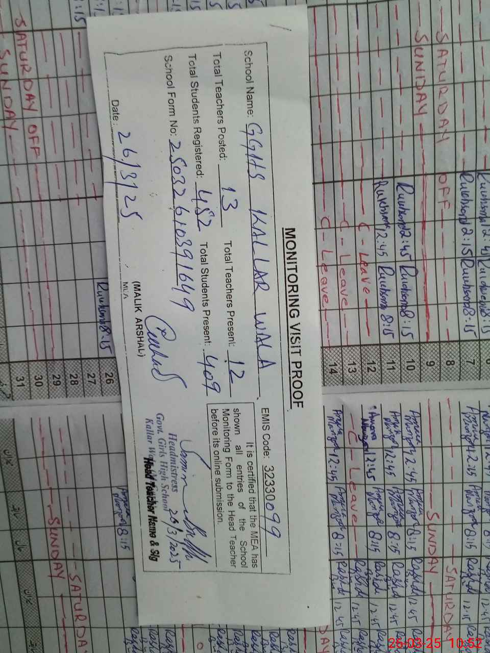 | Attendance Register | Head Teacher | MEA with School | Visit Proof |